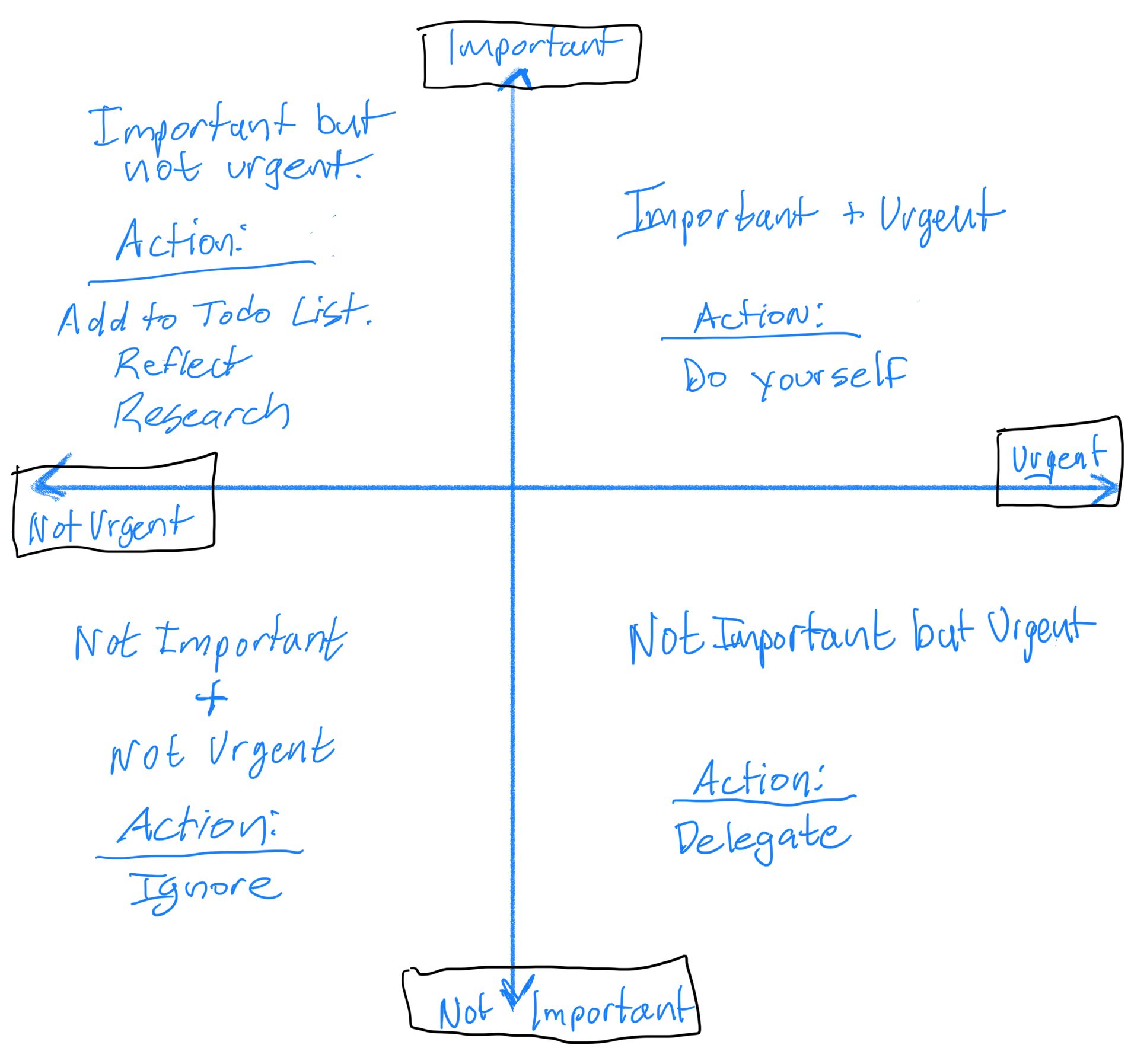 It's a thread on the Eisenhower method of prioritization and its great. Basically, it looks like this. Jobs to be done can be either: 1) important and urgent, 2) important and not urgent, 3) Not important, but urgent, and 4) not important and not urgent. Based on where the job lands on the grid is what we should do. 1) DO yourself, NOW! 2) DO yourself, but later after reflecting and some research, 3) Delegate, and 4) Ignore.